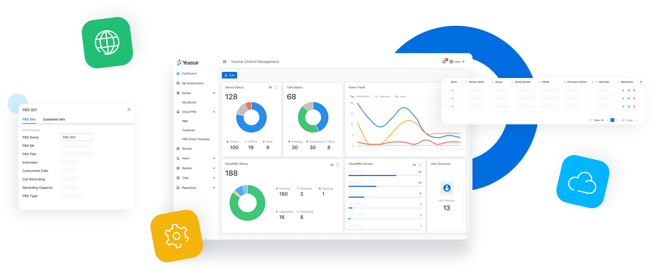 A widget-based dynamic dashboard real-time overview of all your managed PBX, including PBX status, device status, alarm trend, tasks status, etc.